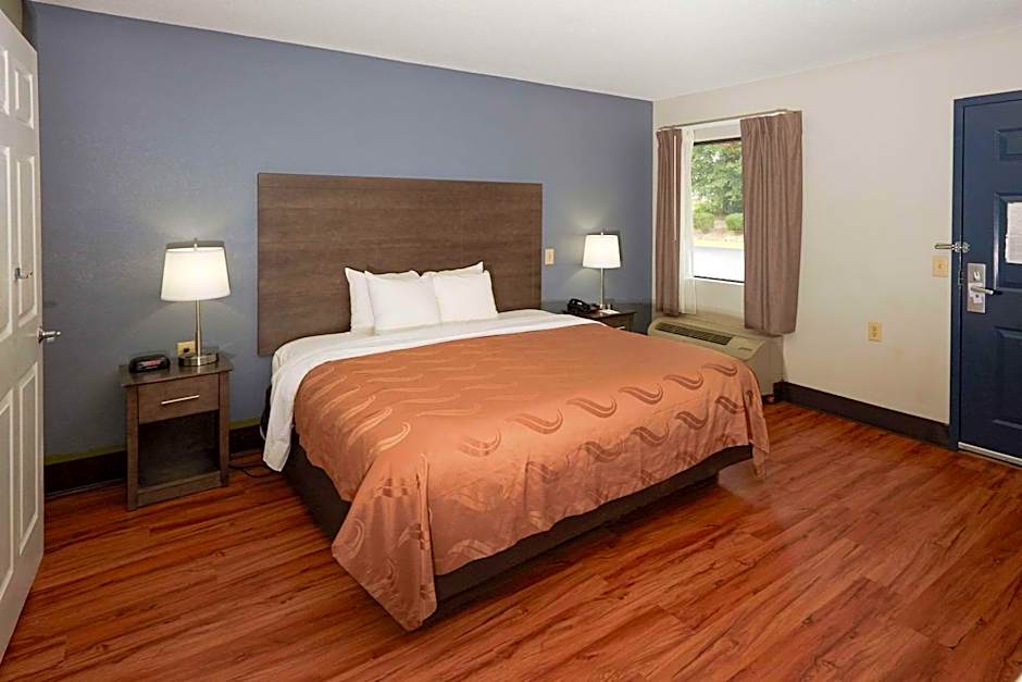 Welcome to our Efficiency King Room, a spacious and cozy double room with a smoking option. Enjoy the luxury of a King size bed, relax in the bathtub, and stay connected with free WiFi and a flat-screen TV. Indulge yourself with amenities like air conditioning, a tea/coffee maker, and complimentary toiletries. Perfect for 2 adults and 1 child, this room ensures a comfortable stay with essential features such as linens, towels, heating, and a wake-up service.